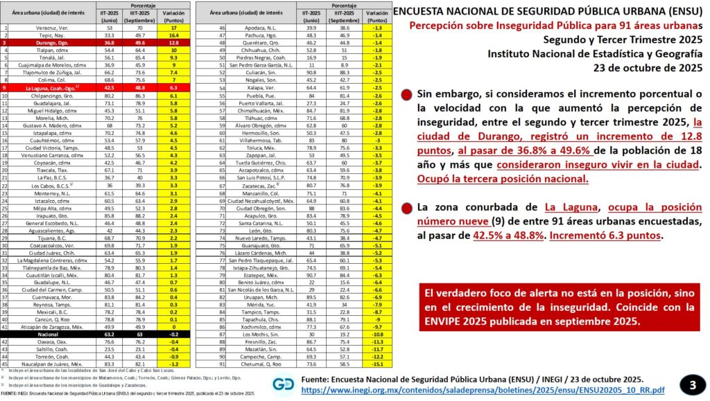 Los resultados más recientes de la Encuesta Nacional de Victimización y Percepción sobre Seguridad Pública (ENVIPE) 2025, publicados por el INEGI, han encendido las alarmas a nivel nacional, pero resuenan con especial preocupación en Durango. Si bien el país enfrenta un aumento en la victimización delictiva, con una tasa de 24,135 víctimas por cada 100,000 […]