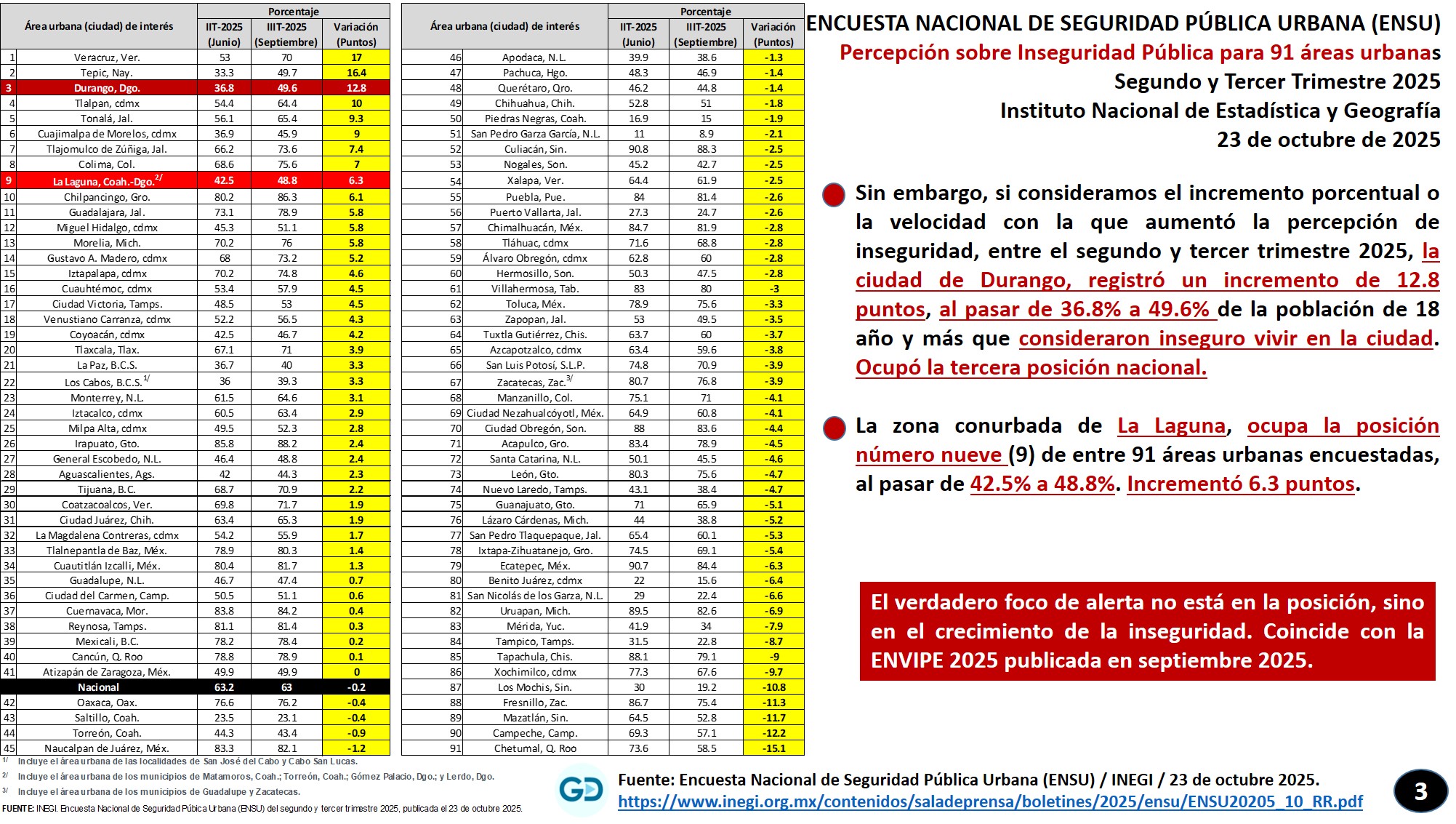• Entre junio y septiembre de 2025, la ciudad de Durango, Dgo., tuvo un incremento significativo en la percepción de inseguridad (36.8% a 49.6%, un aumento de 12.8 puntos). Ocupa el tercer lugar nacional.
