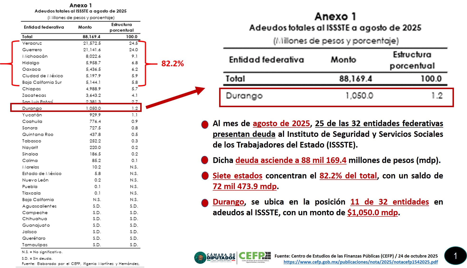- Durango ocupa la cuarta posición de 32 entidades, con un adeudo de 1,019.6 mdp (9.1% del total de esta categoría).