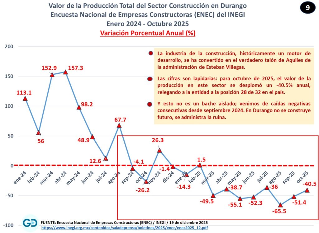 El reporte evidencia una contracción generalizada en la economía duranguense hacia el año 2025, caracterizada por la caída en la productividad, tasas de crecimiento negativas y metas de empleo incumplidas. Practicamente una recesión económica.